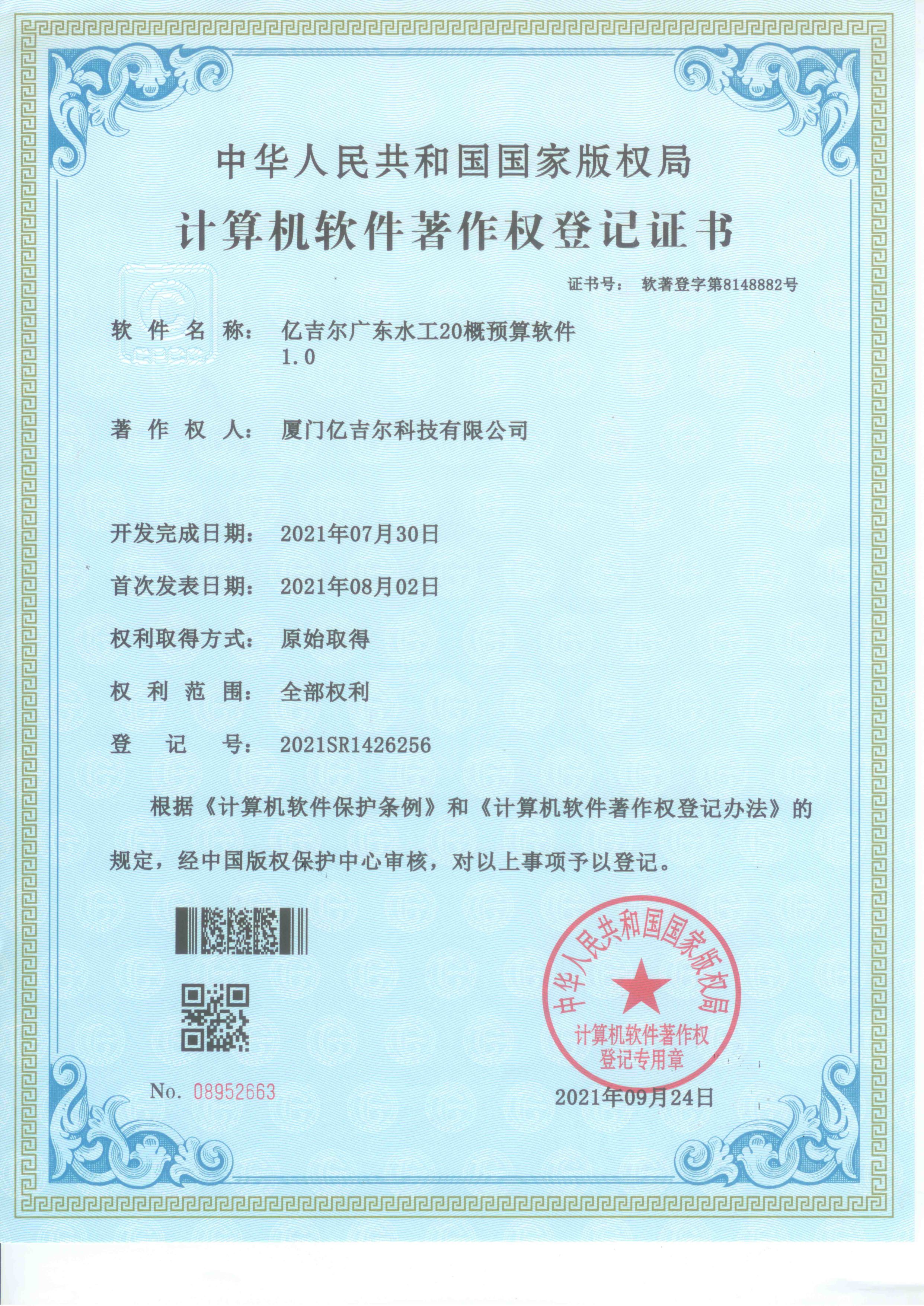 億吉爾廣東水工20概預(yù)算軟件著作權(quán)登記證書 發(fā)布日期:2023年11月22日 瀏覽次數(shù):3016 關(guān)鍵字: 公司 1/1億吉爾廣東水工20概預(yù)算軟件著作權(quán)登記證書_1