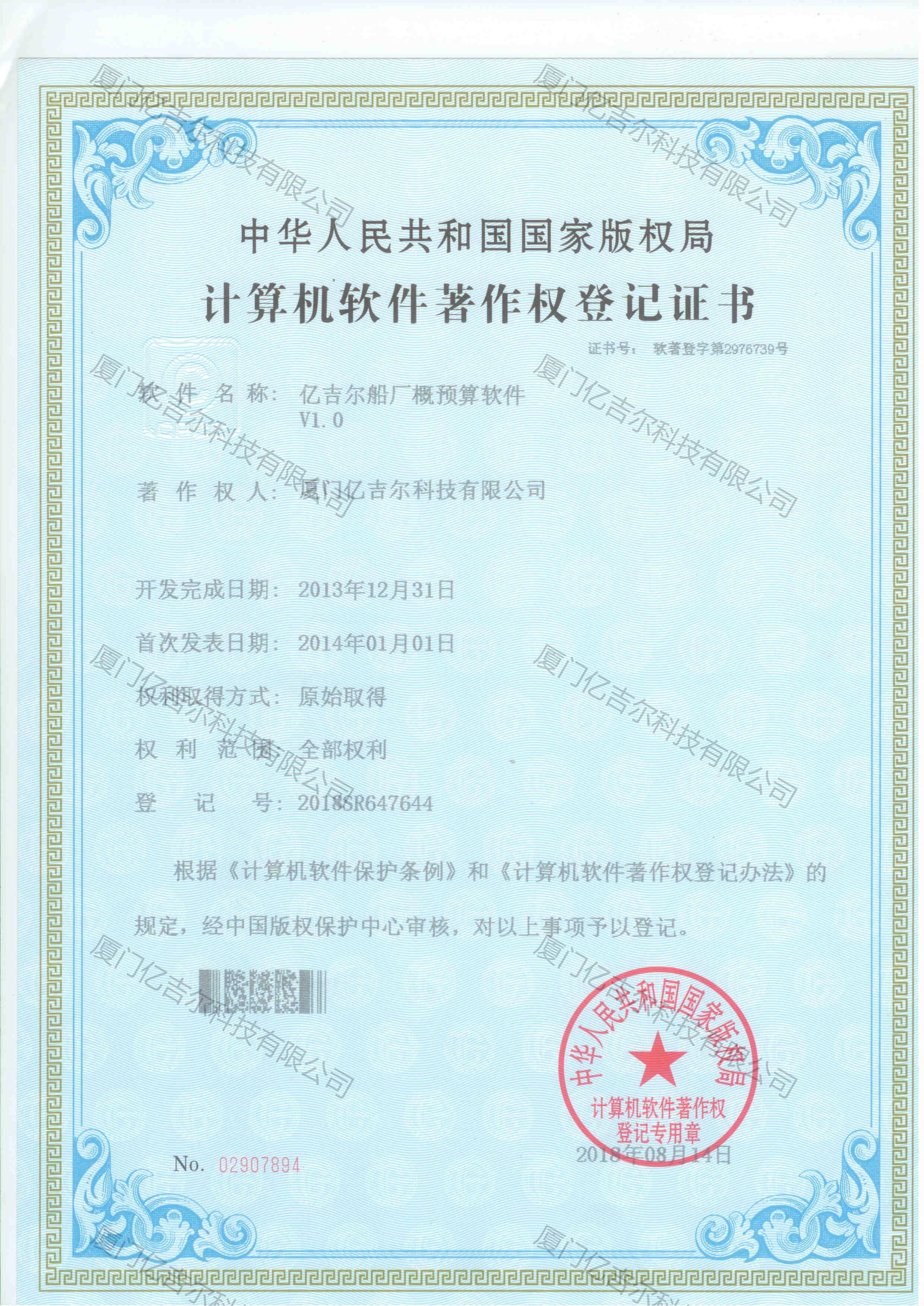 億吉爾船廠概預(yù)算軟件著作權(quán)登記證書 發(fā)布日期:2018年08月14日 瀏覽次數(shù):4392 關(guān)鍵字: 公司 1/1億吉爾船廠概預(yù)算軟件著作權(quán)登記證書