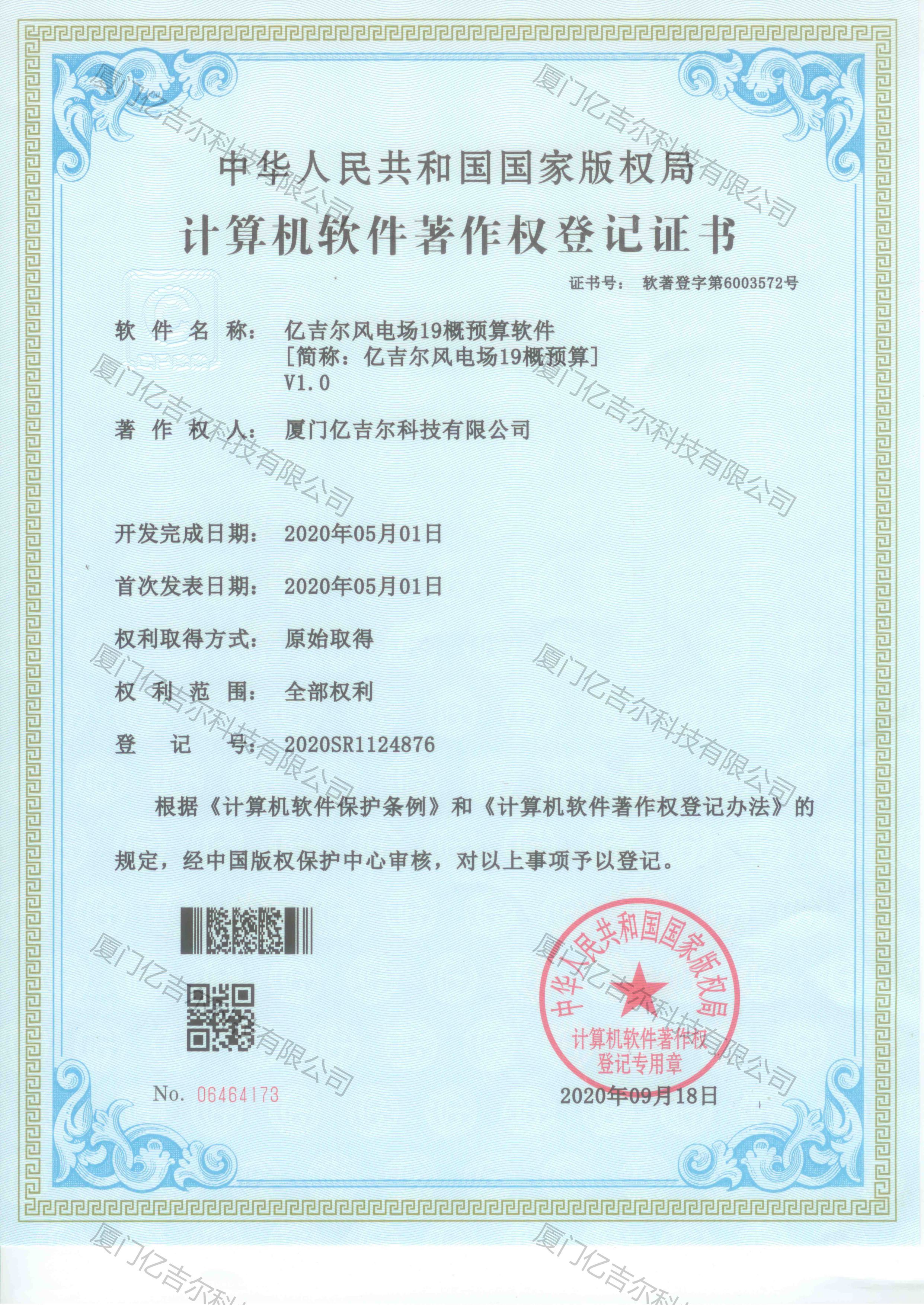 億吉爾風(fēng)電場(chǎng)19概預(yù)算軟件著作權(quán)登記證書 發(fā)布日期:2020年09月18日 瀏覽次數(shù):4591 關(guān)鍵字: 公司 1/1億吉爾風(fēng)電場(chǎng)19概預(yù)算軟件著作權(quán)登記證書