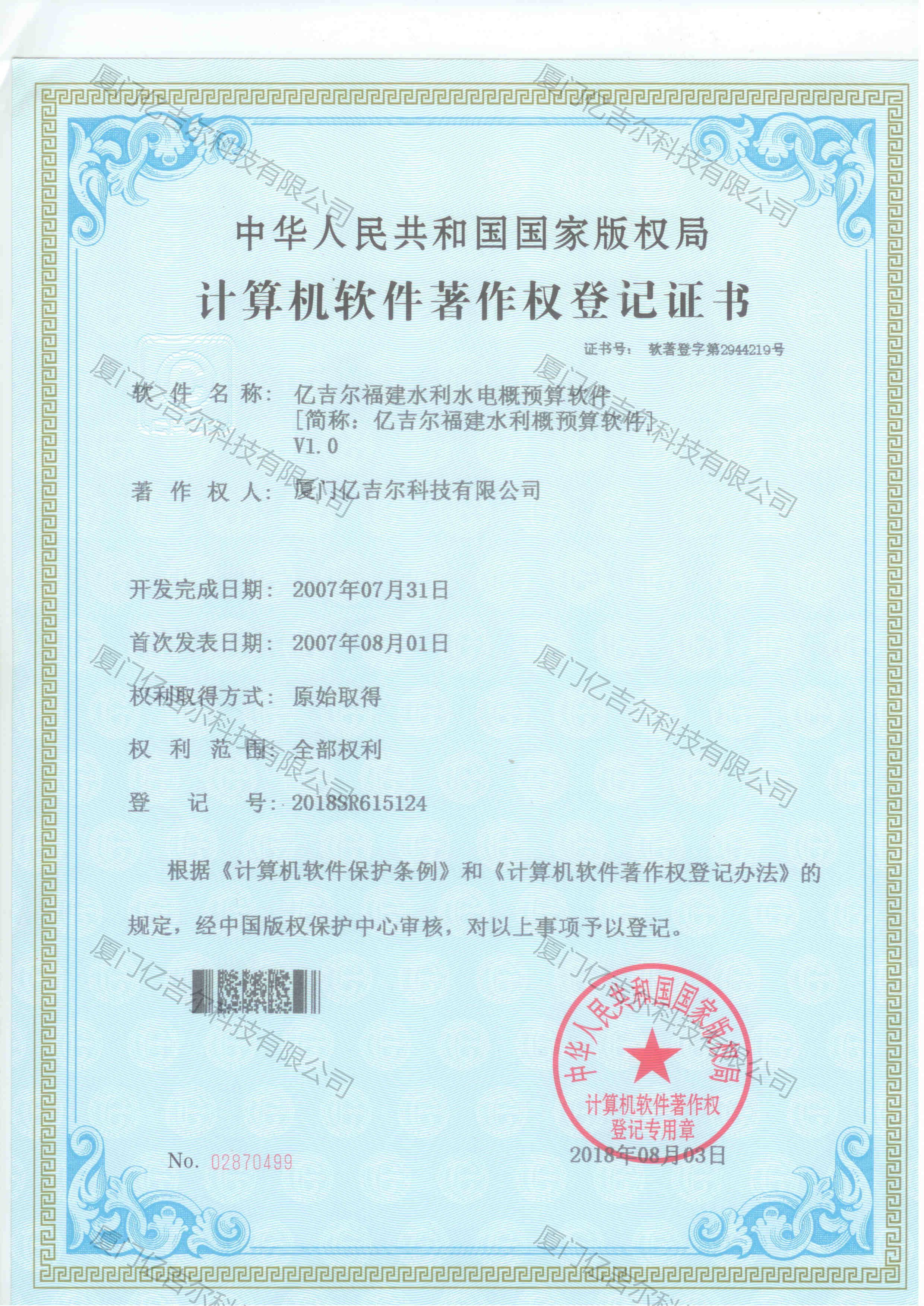億吉爾福建水利水電概預(yù)算軟件著作權(quán)登記證書 發(fā)布日期:2018年08月03日 瀏覽次數(shù):4195 關(guān)鍵字: 公司 1/1億吉爾福建水利水電概預(yù)算軟件著作權(quán)登記證書
