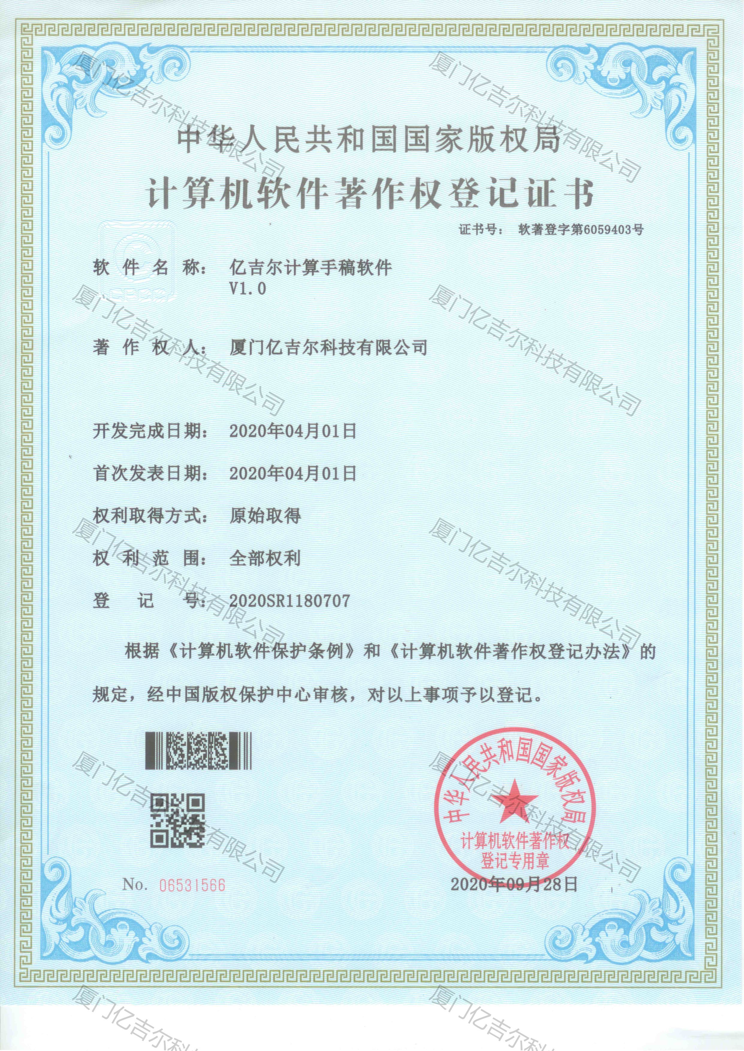 億吉爾計(jì)算手稿軟件著作權(quán)登記證書(shū) 發(fā)布日期:2020年09月28日 瀏覽次數(shù):4632 關(guān)鍵字: 公司 1/1億吉爾計(jì)算手稿軟件著作權(quán)登記證書(shū)