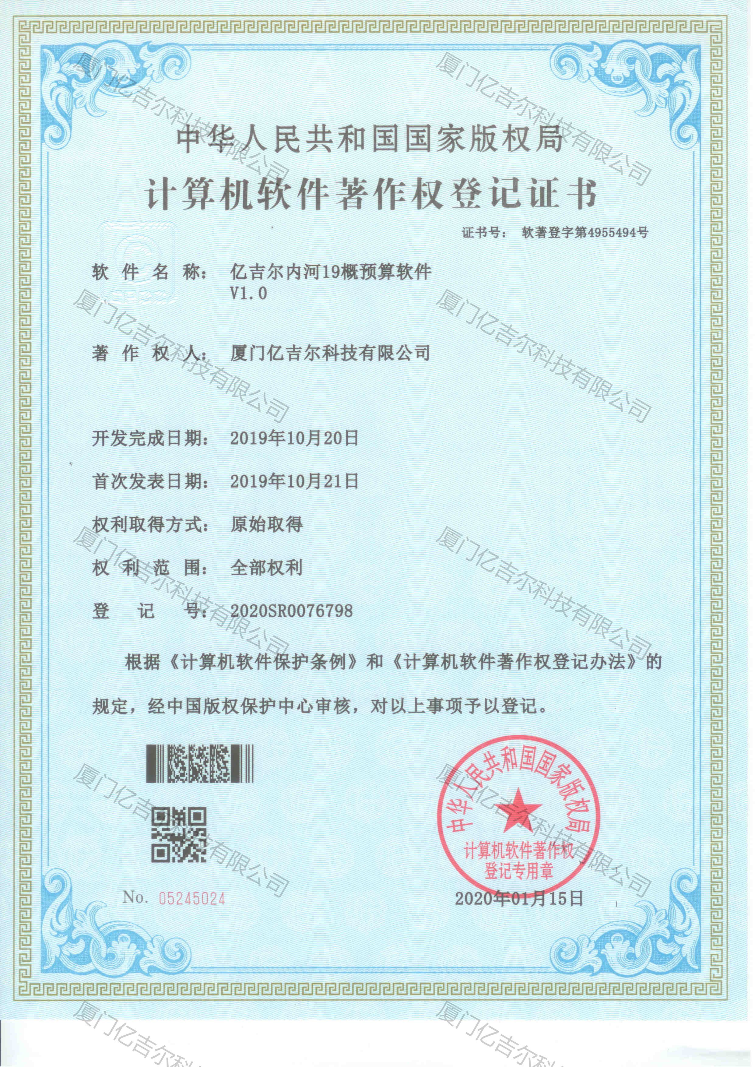 億吉爾內(nèi)河19概預(yù)算軟件著作權(quán)登記證書 發(fā)布日期:2020年01月15日 瀏覽次數(shù):4805 關(guān)鍵字: 公司 1/1億吉爾內(nèi)河19概預(yù)算軟件著作權(quán)登記證書