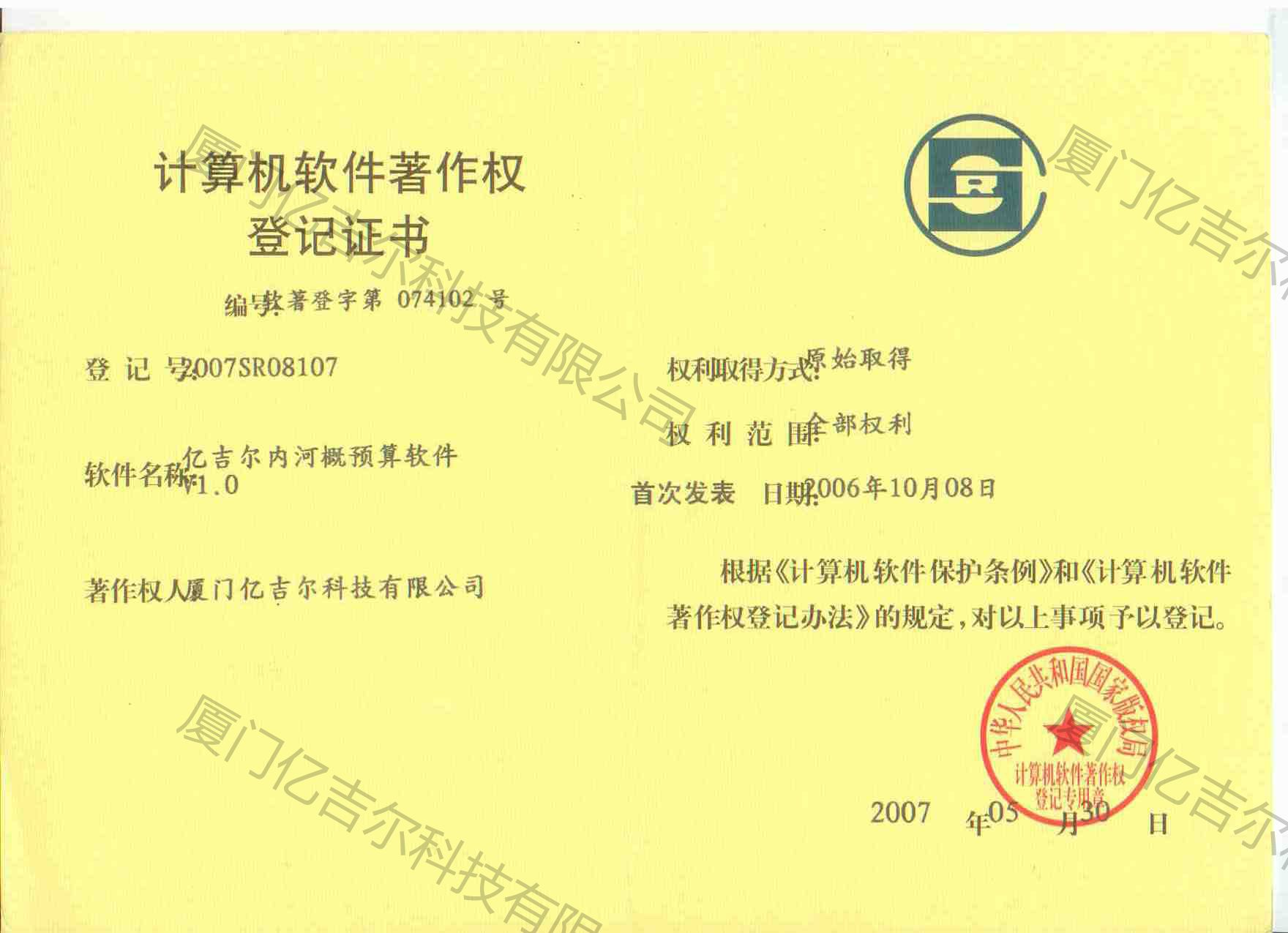 億吉爾內(nèi)河概預算軟件著作權(quán)登記證書 發(fā)布日期:2007年05月30日 瀏覽次數(shù):4062 關(guān)鍵字: 公司 1/1億吉爾內(nèi)河概預算軟件著作權(quán)登記證書