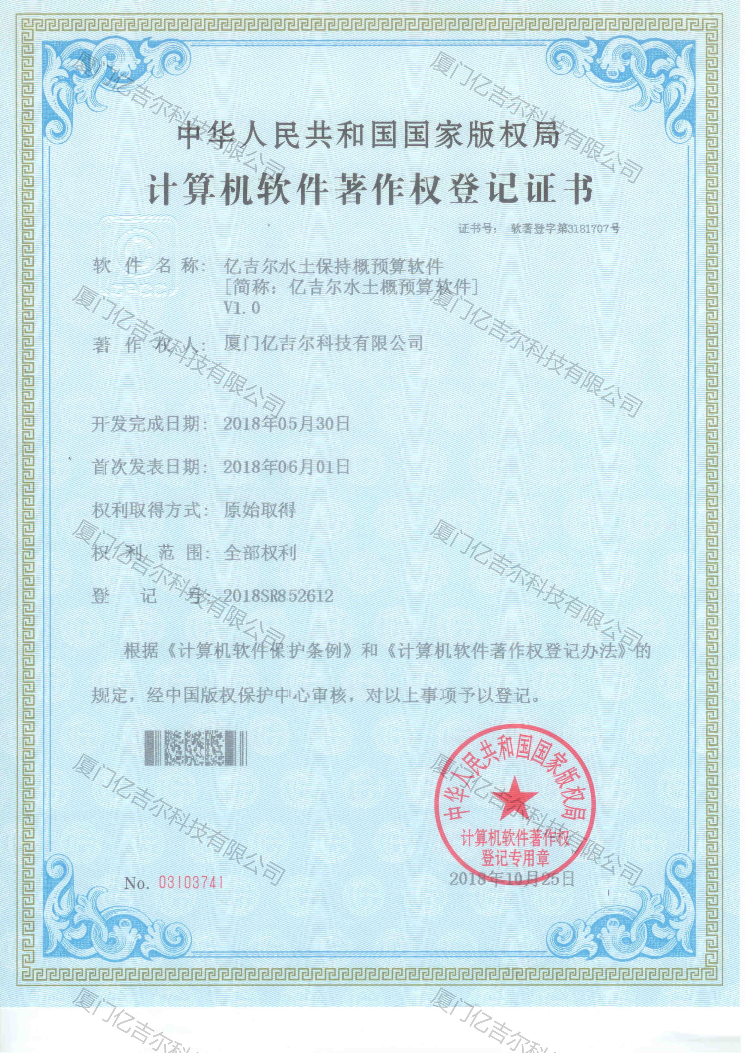億吉爾水土保持概預(yù)算軟件著作權(quán)登記證書 發(fā)布日期:2018年10月25日 瀏覽次數(shù):4457 關(guān)鍵字: 公司 1/1億吉爾水土保持概預(yù)算軟件著作權(quán)登記證書