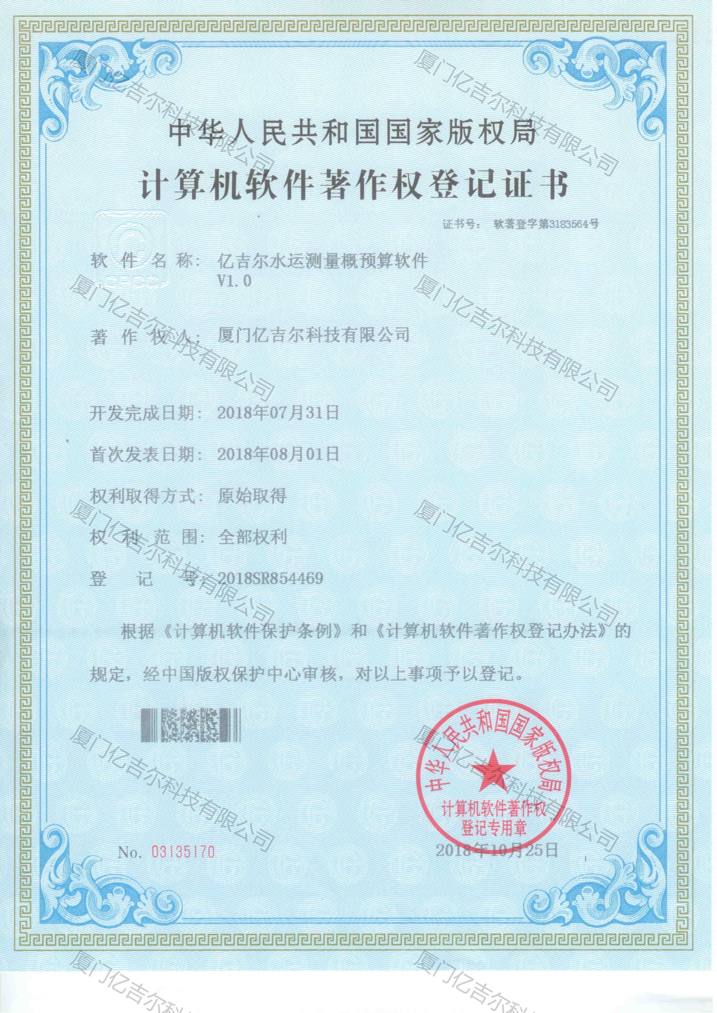 億吉爾水運(yùn)測(cè)量概預(yù)算軟件著作權(quán)登記證書 發(fā)布日期:2018年10月25日 瀏覽次數(shù):4462 關(guān)鍵字: 公司 1/1億吉爾水運(yùn)測(cè)量概預(yù)算軟件著作權(quán)登記證書