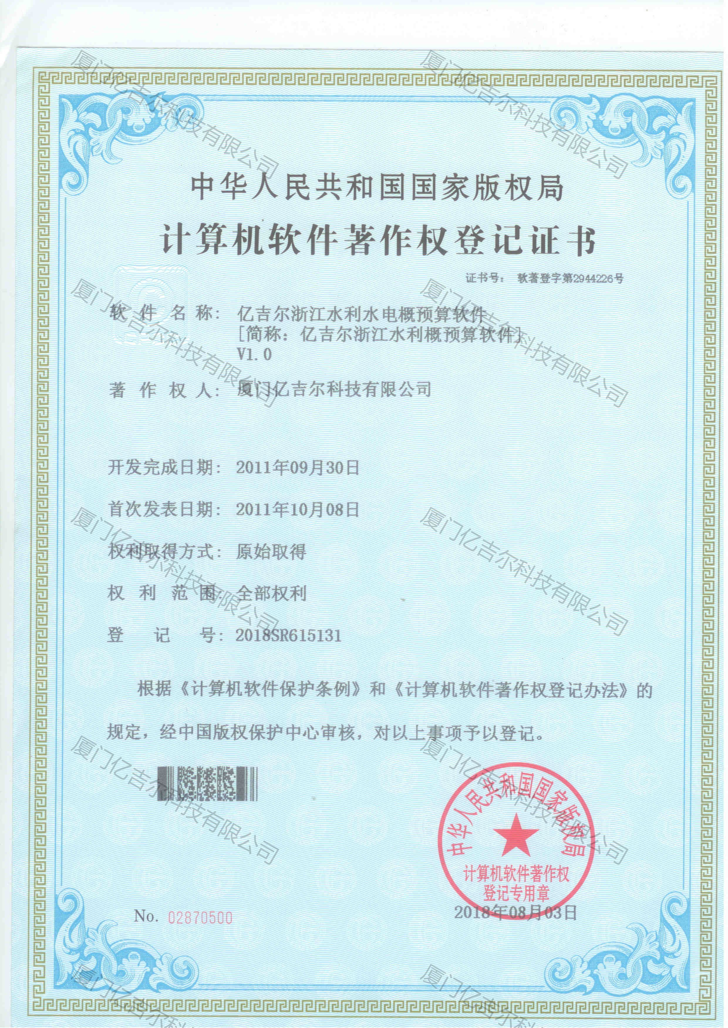 億吉爾浙江水利水電概預(yù)算軟件著作權(quán)登記證書 發(fā)布日期:2018年08月03日 瀏覽次數(shù):4136 關(guān)鍵字: 公司 1/1億吉爾浙江水利水電概預(yù)算軟件著作權(quán)登記證書